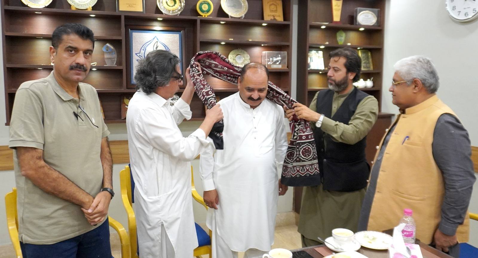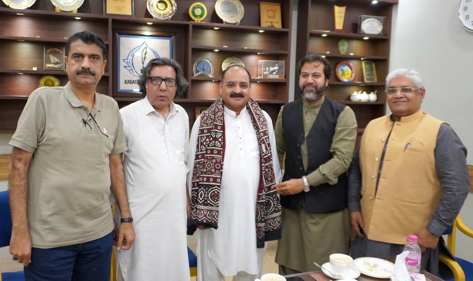 Senior journalist Saeed Sarbazi was also present at the meeting. Following a luncheon, the KPC President and Joint Secretary honored Zubair Qureshi with the traditional Sindhi Ajrak, symbolizing Sindh’s rich cultural heritage.