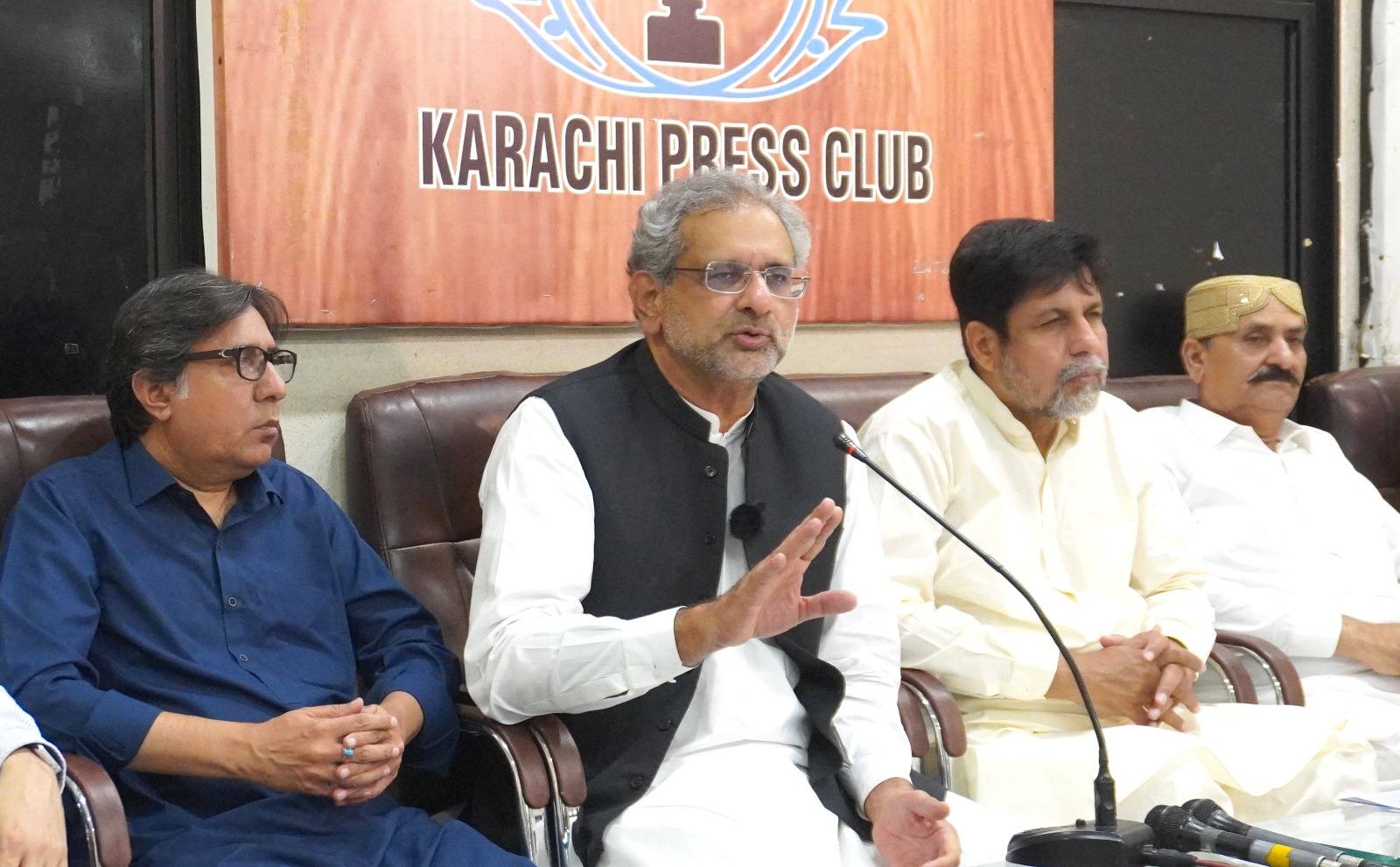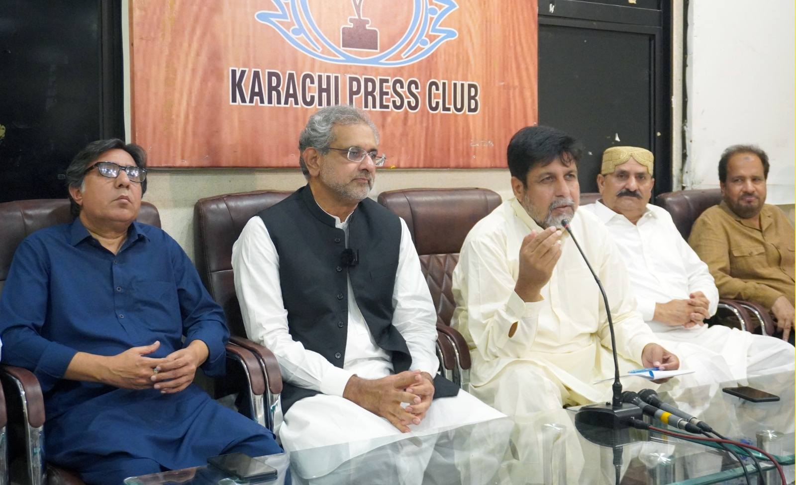 Former Prime Minister and head of Awam Pakistan Party, Shahid Khaqan Abbasi, addressed the Meet the Press event at the Karachi Press Club. He was joined by former Finance Minister Miftah Ismail and other notable guests.
