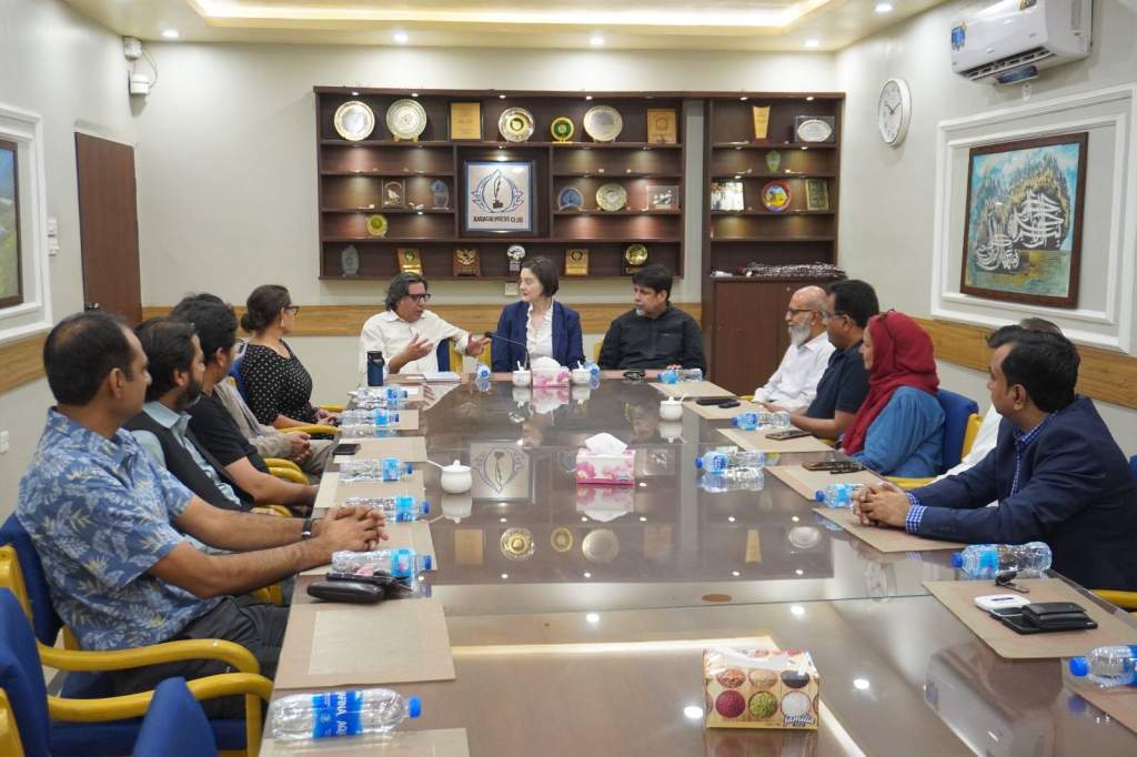 The delegation was warmly welcomed by the governing body of the Karachi Press Club, including President Fazil Jamili and Secretary Sohail Afzal Khan. During the visit, the delegation expressed their happiness to be at the Karachi Press Club, commending the historic building and impressive arrangements.