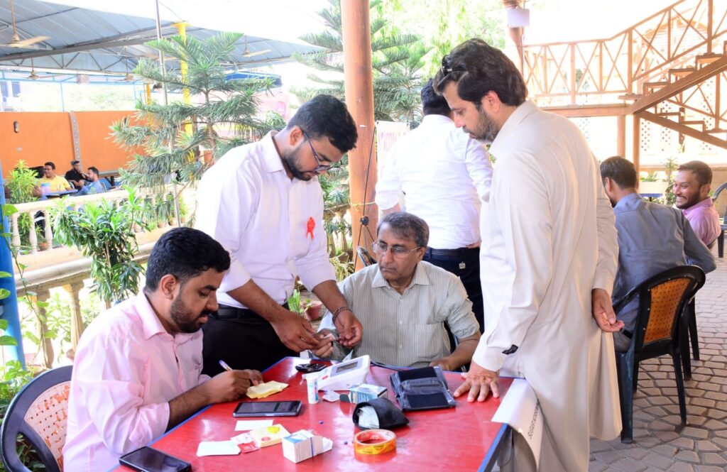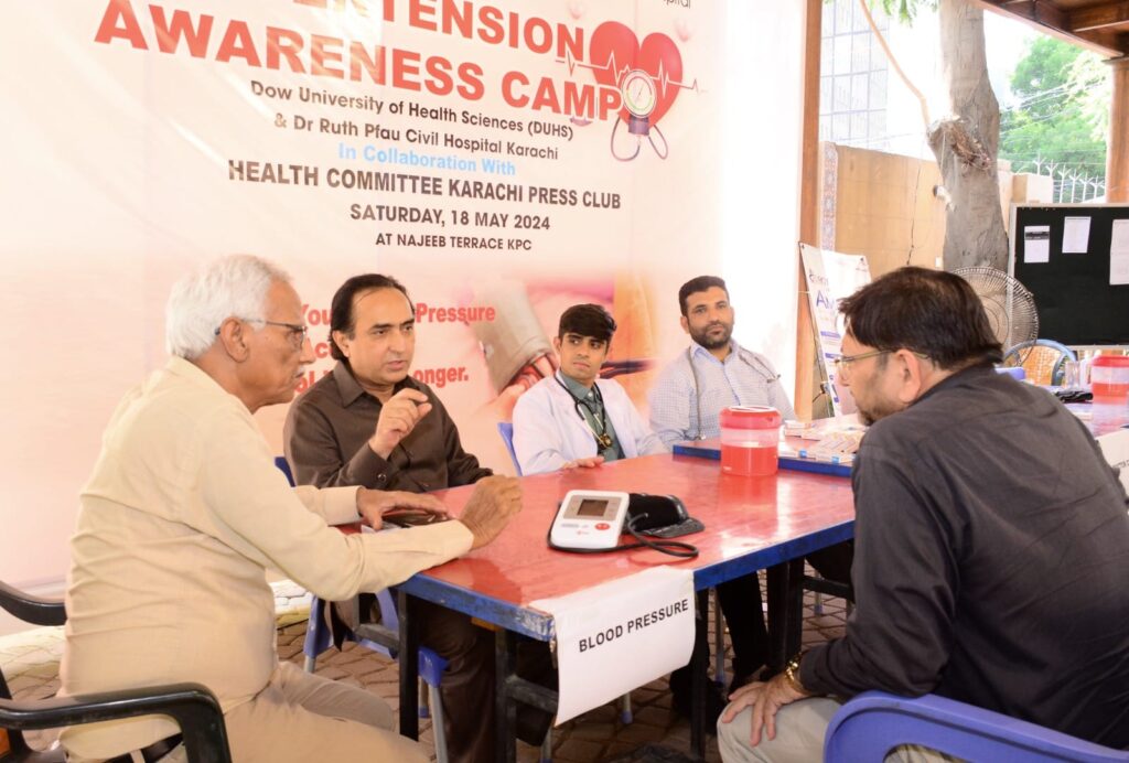 In collaboration with Dow University of Health Sciences, the Karachi Press Club organized a health awareness camp for its members and their families in recognition of World Hypertension Day. The camp featured essential health tests, including blood pressure, blood sugar, BMI, and cardiac function assessments.