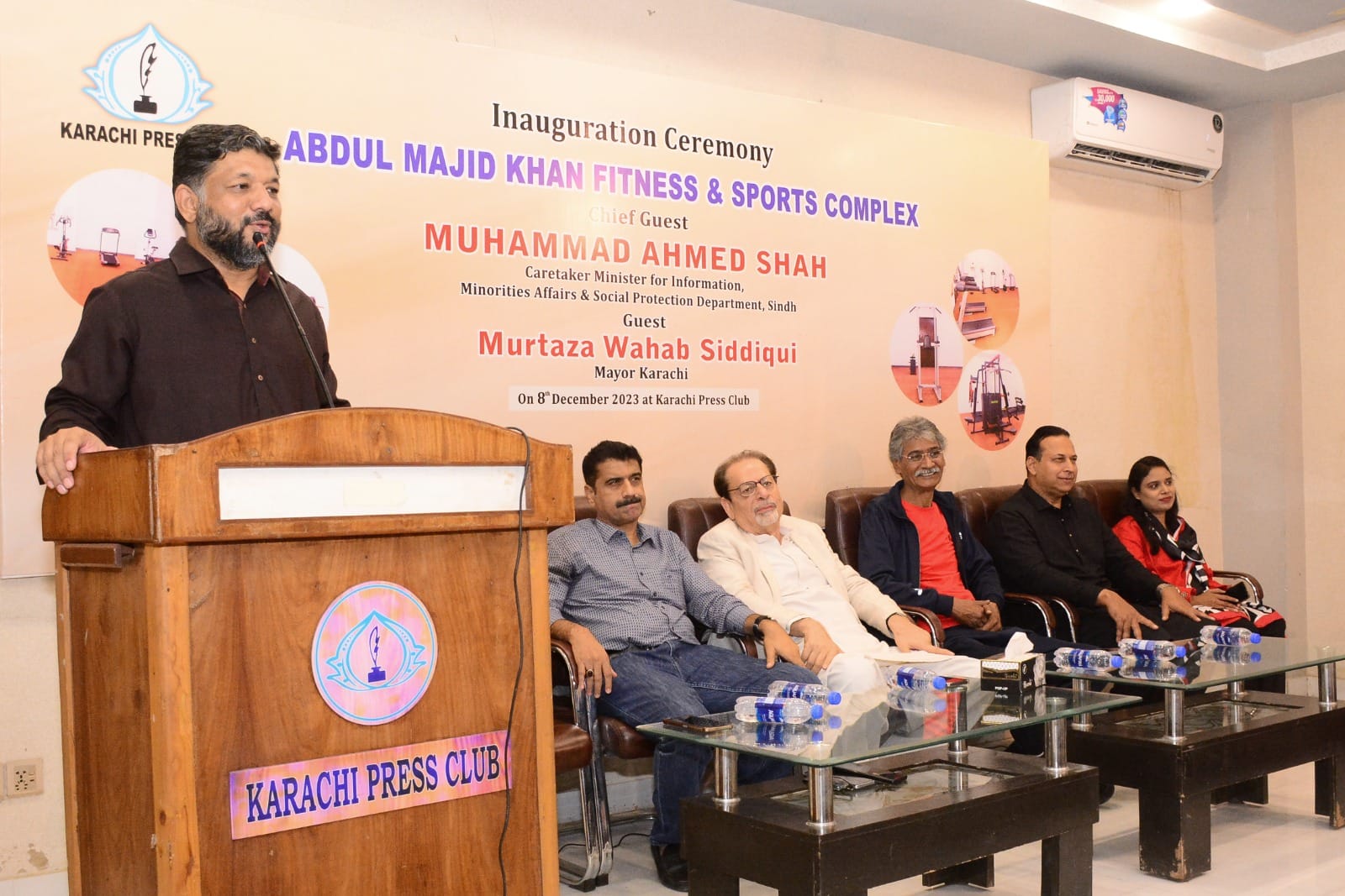 Caretaker Provincial Minister for Information, Minority Affairs, Social Security and President Arts Council Muhammad Ahmad Shah and Mayor Karachi Murtaza Wahab inaugurated “Abdul Majid Khan Fitness and Sports Complex” at Karachi Press.