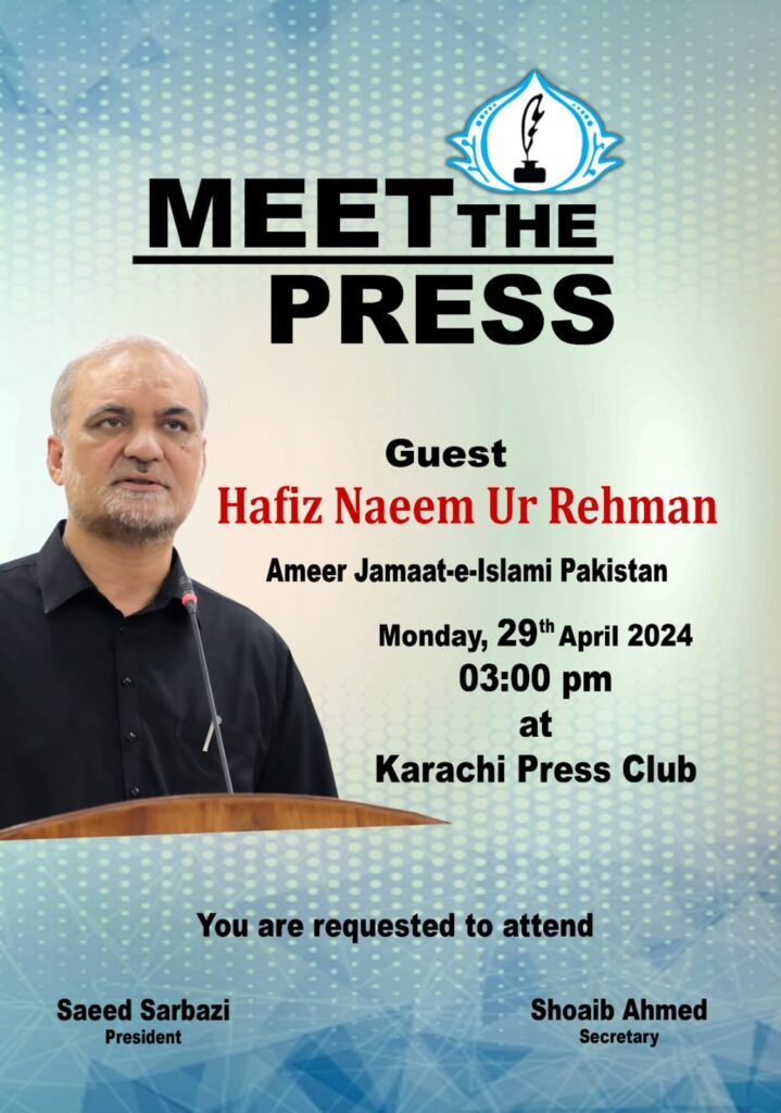 The Karachi Press Club cordially invites you to its traditional program, “Meet the Press,” where the newly elected Ameer of Jamaat-e-Islami Pakistan, Engineer Hafiz Naeem ur Rahman, has been invited as a guest.